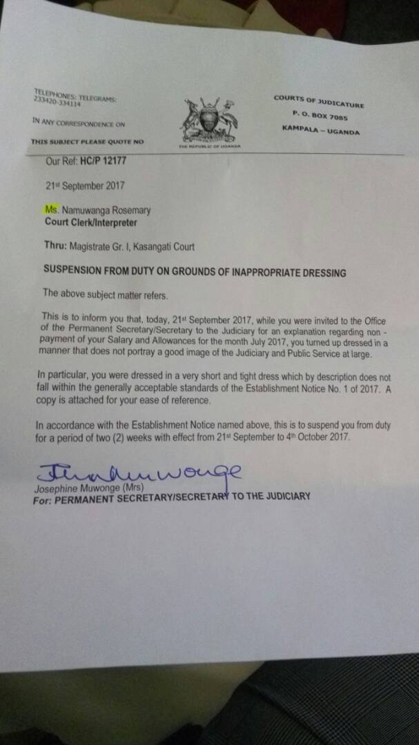 Namuwanga who works as a court clerk and also an interpreter at the Kasangati Magistrates Court, Grade 1 was on the 21st of September, 2017 suspended from her job for “inappropriate dressing”- the suspension letter read.
