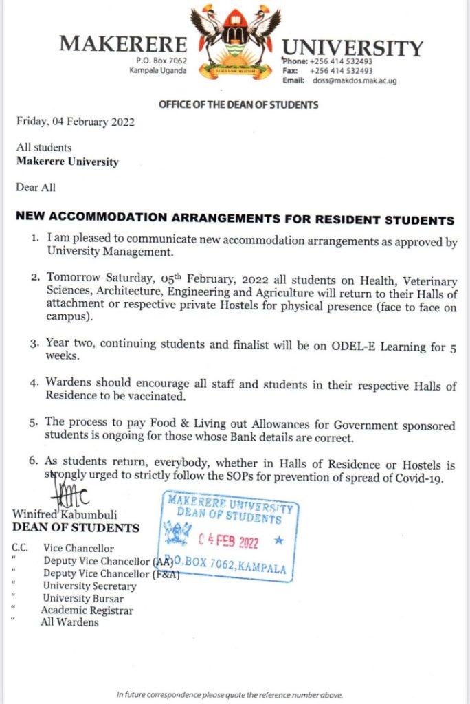 - Saturday, 05th February, 2022 all students on Health, Veterinary Sciences, Architecture, Engineering and Agriculture will return to their Halls of attachment or respective private Hostels for physical presence (face to face on campus).