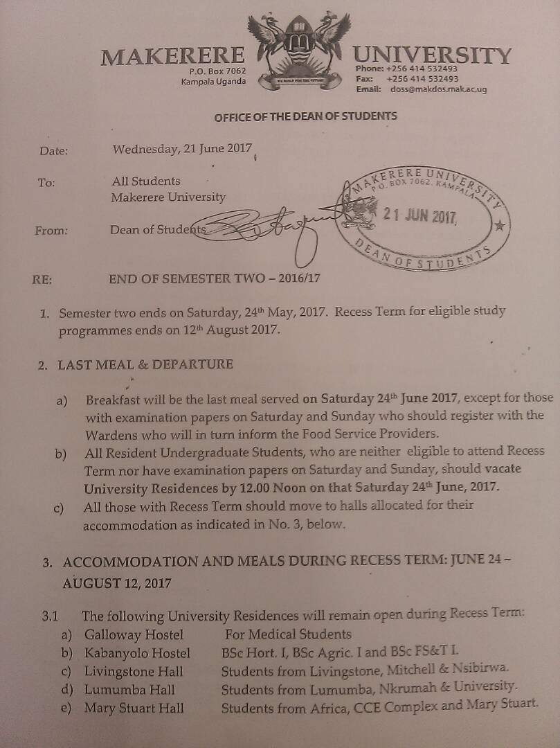 In a letter dated Wednesday 21st June, 2017 and addressed to the students’ fraternity of Makerere University, the dean of students Mr. Cyriaco Kabagambe has said that the semester officially closes on Saturday 24th June, 2017. To the hall residing students, breakfast shall be the only meal served that day as they expect everyone to have vacated by midday save for those that have papers on Saturday and Sunday who are required to have registered with their respective wardens for appropriate consideration.